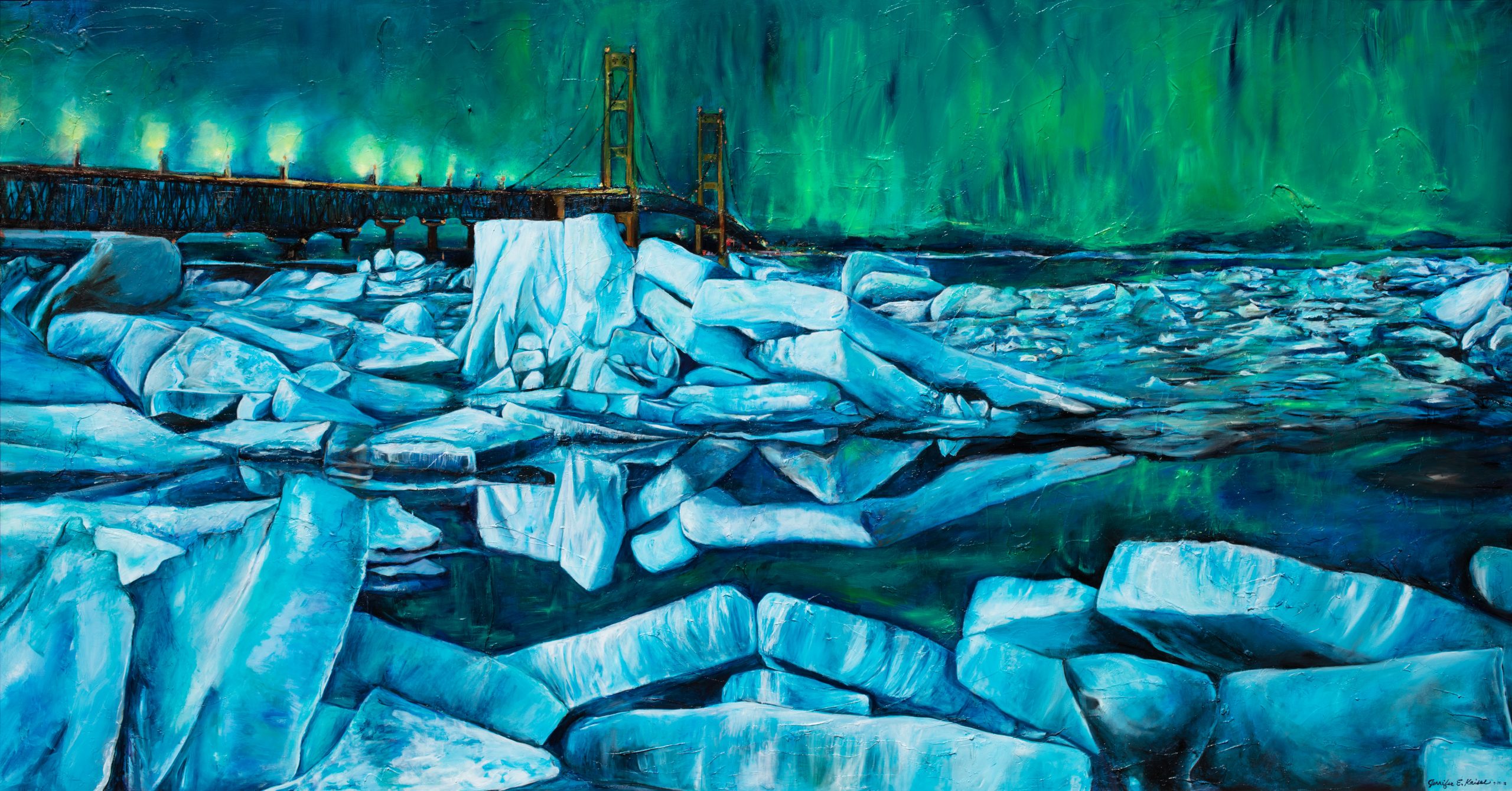 This artwork is a large-scale installation of the Rare Blue Ice that formed at the Straits of Mackinac flowing underneath the Mackinac Bridge where Lake Michigan meets Lake Huron. This is also the place where the “Enbridge Line 5 pipeline” travels. Also depicted in this Installation are the Northern Lights that appeared in the late spring sky one of these natural phenomena occurrences is a rarity, but two happening at the same time is once in a lifetime event. This event took place in March 2018.